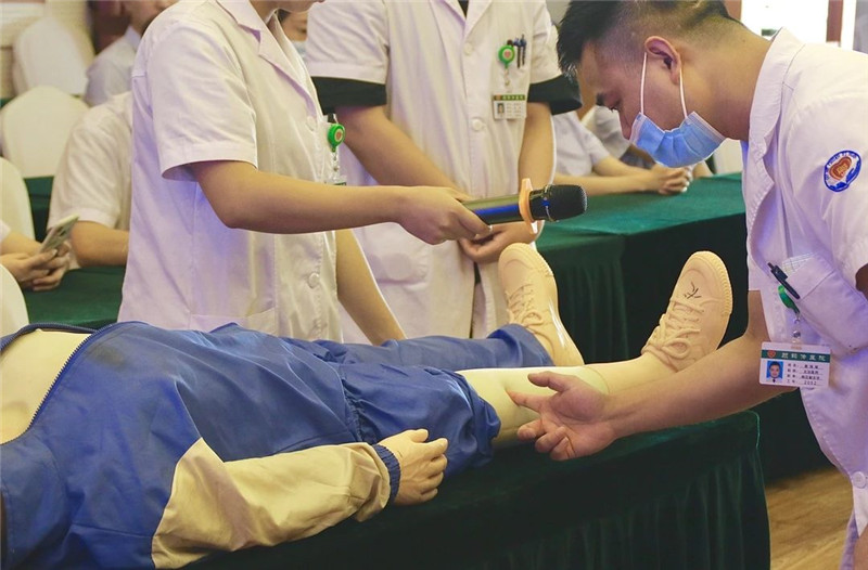 本次大賽活動環(huán)節(jié)共有兩大項,第一項為“臨床技能操作考核”??己藘?nèi)容分病史采集、體格檢查、首次病程錄書寫、病歷書寫、臨床思維與決策、基本技能操作(心肺復(fù)蘇、氣管插管)和??萍寄懿僮鳎ü强疲C總€臨床科室派兩位醫(yī)師參加技能考核,采取隨機抽題的形式,現(xiàn)場操作演示并作答。