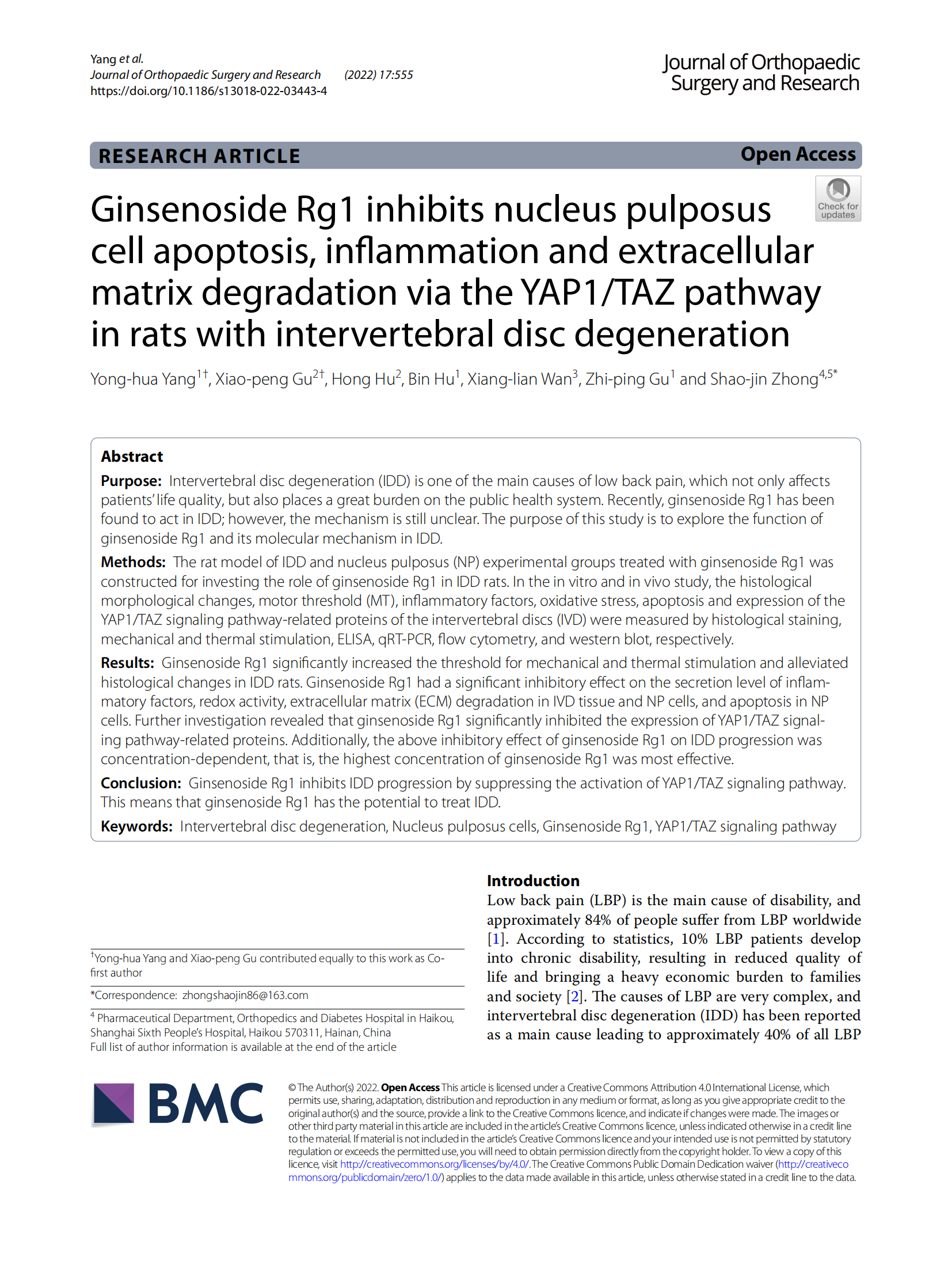 由我院顧霄鵬、胡鴻醫(yī)師參與撰寫的醫(yī)學(xué)論文《Ginsenoside Rg1 inhibits nucleus pulposus cell apoptosis, inflammation and extracellular matrix degradation via the YAP1/TAZ pathway in rats with intervertebral disc degeneration》于2022年12月20日在SCI期刊Journal of Orthopaedic Surgery and Research上發(fā)表。