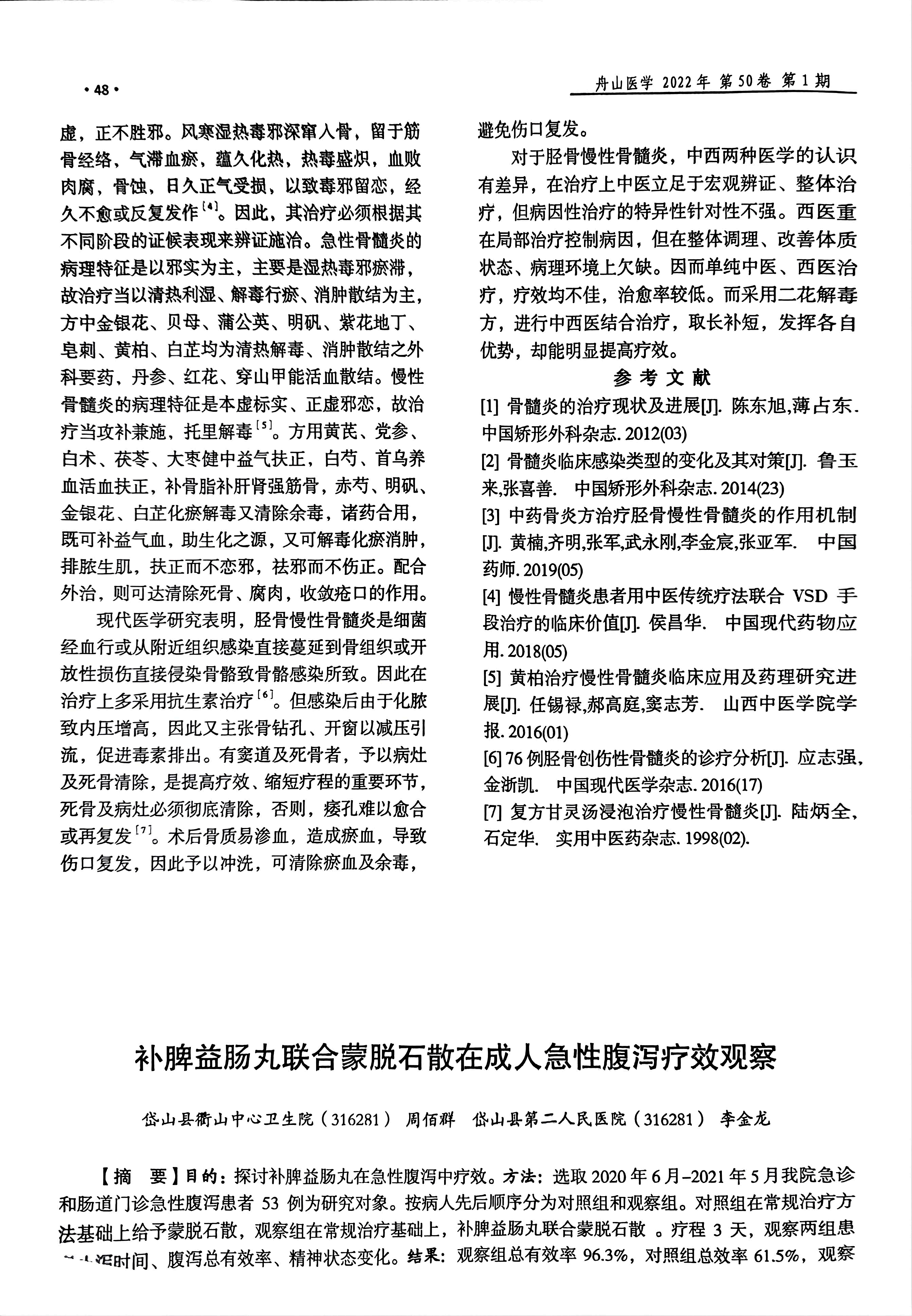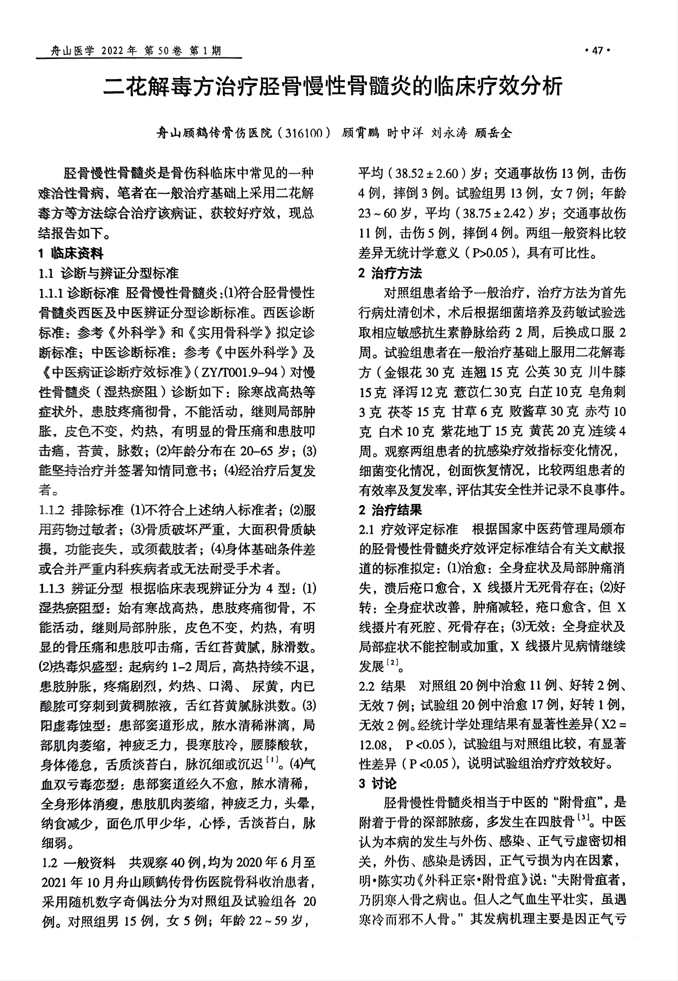 由我院顧霄鵬、時中洋、劉永濤、顧岳全醫(yī)師參與撰寫的醫(yī)學論文《二花解毒方治療脛骨慢性骨髓炎的臨床療效分析》在《舟山醫(yī)學》2022年50卷第一期上發(fā)表。