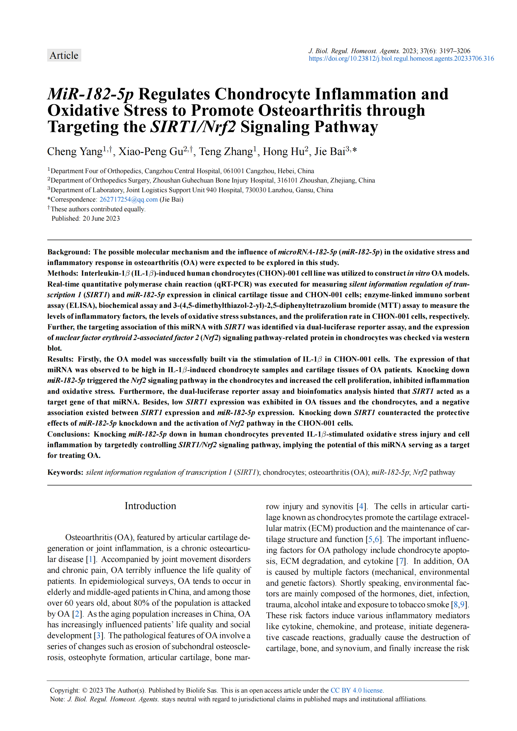 由我院顧霄鵬、胡鴻等醫(yī)師參與撰寫(xiě)的醫(yī)學(xué)論文《MiR-182-5p Regulates Chondrocyte Inflammation and Oxidative Stress to Promote Osteoarthritis through Targeting the SIRT1/Nrf2 Signaling Pathway》于2023年6月20日在SCI期刊Journal of Biological Regulators and Homeostatic Agents上發(fā)表。
