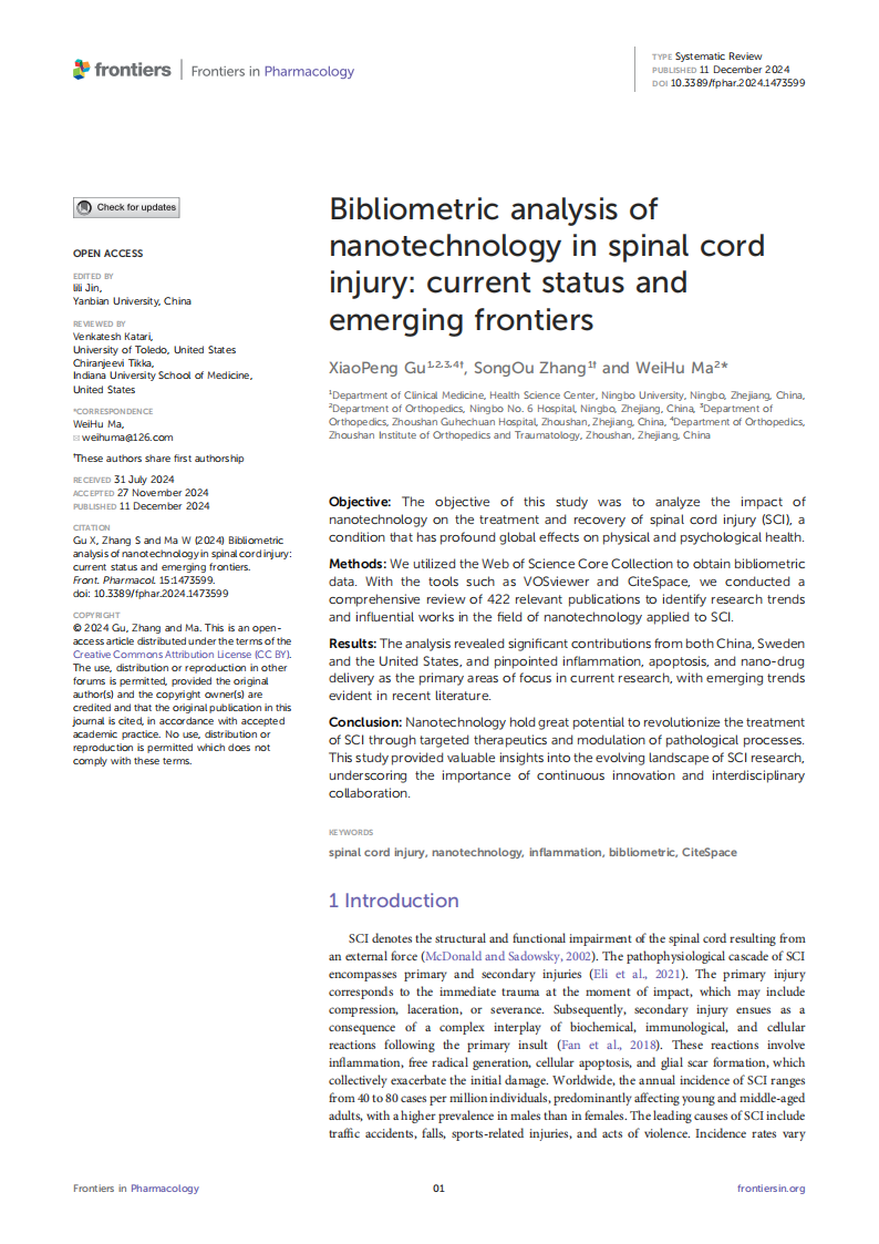 由我院顧霄鵬、張宋歐等醫(yī)師參與撰寫的醫(yī)學(xué)論文《Bibliometric analysis of nanotechnology in spinal cord injury: current status and emerging frontiers》于2024年12月11日在SCI期刊Front Pharmacol上發(fā)表。