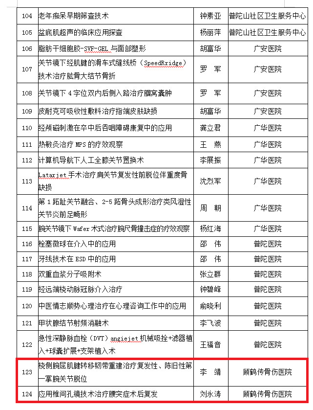 我院李靖醫(yī)師的“橈側(cè)腕屈肌腱轉(zhuǎn)移韌帶重建治療復(fù)發(fā)性(陳舊性)第一掌腕關(guān)節(jié)脫位”和劉永濤醫(yī)師的“應(yīng)用椎間孔鏡技術(shù)治療腰突癥術(shù)后復(fù)發(fā)”兩項技術(shù)被納入2018年度舟山市醫(yī)學(xué)新技術(shù)項目。