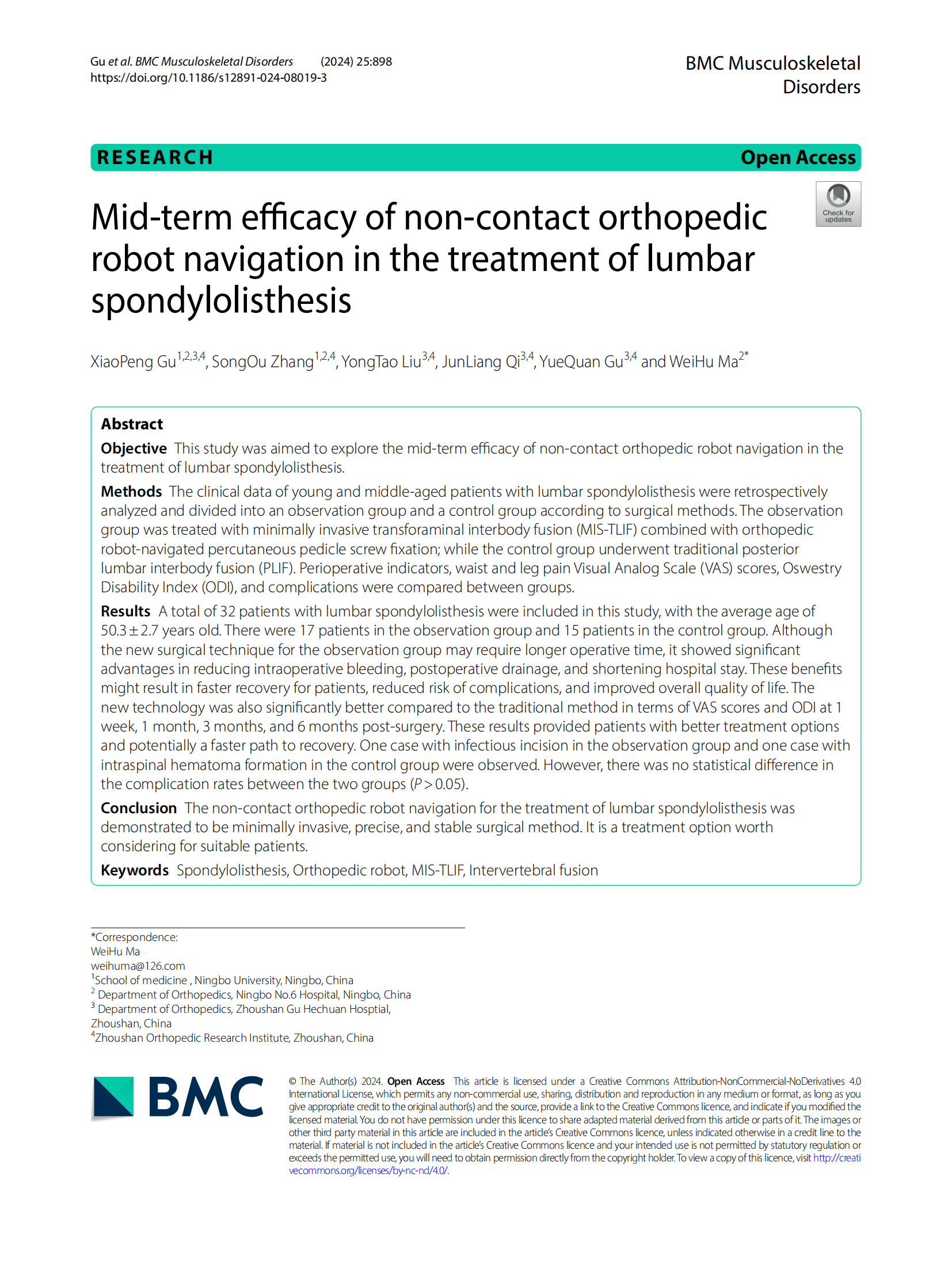 由我院顧霄鵬、張宋歐、劉永濤等醫(yī)師參與撰寫的醫(yī)學論文《Mid-term efficacy of non-contact orthopedic robot navigation in the treatment of lumbar spondylolisthesis》于2024年11月9日在SCI期刊Front Pharmacol上發(fā)表。