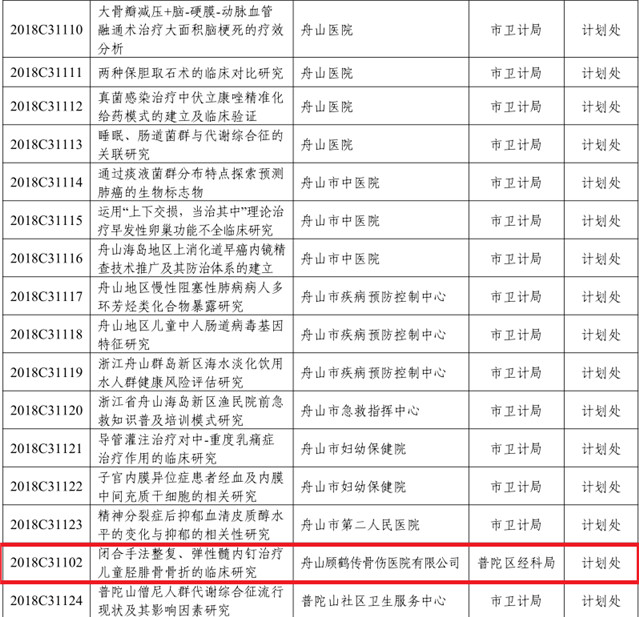我院的《閉合手法整復(fù)、彈性髓內(nèi)釘治療兒童脛腓骨骨折的臨床研究》被納入2018年度第二批市級科技項目。