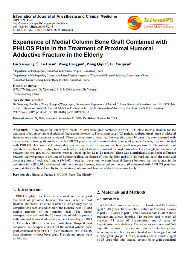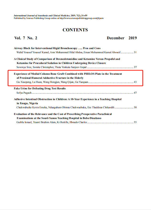 我院顧霄鵬、顧岳全、翁宏軍、王奇軍等撰寫的論文《Experience of Medial Column Bone Graft Combined with PHILOS Plate in the Treatment of Proximal Humeral Adductive Fracture in the Elderly》在國外權威期刊《International Journal of Anesthesia and Clinical Medicine》2019年第7卷第2期上發(fā)表。