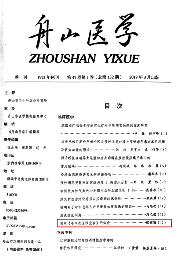 由我院張麗麗護(hù)士長(zhǎng)撰寫的論文《使用<手術(shù)安全核查表>的體會(huì)》在《舟山醫(yī)學(xué)》2019年47卷第1期上發(fā)表。