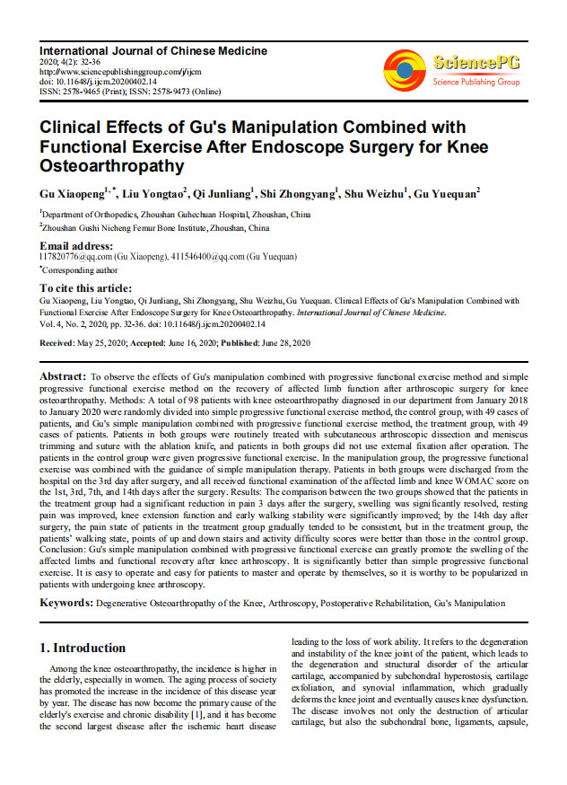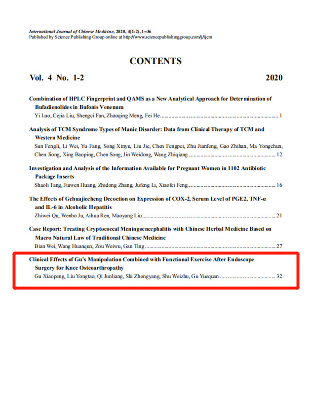 由我院顧霄鵬、劉永濤、戚軍良、時(shí)中洋、舒?zhèn)ブ?、顧岳全撰寫的論文《Clinical Effects of Gu's Manipulation Combined with Functional Exercise After Endoscope Surgery for Knee Osteoarthropathy 》在《International Journal of Chinese Medicine》上發(fā)表。