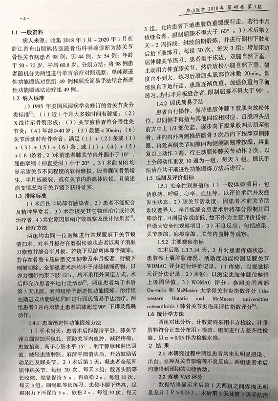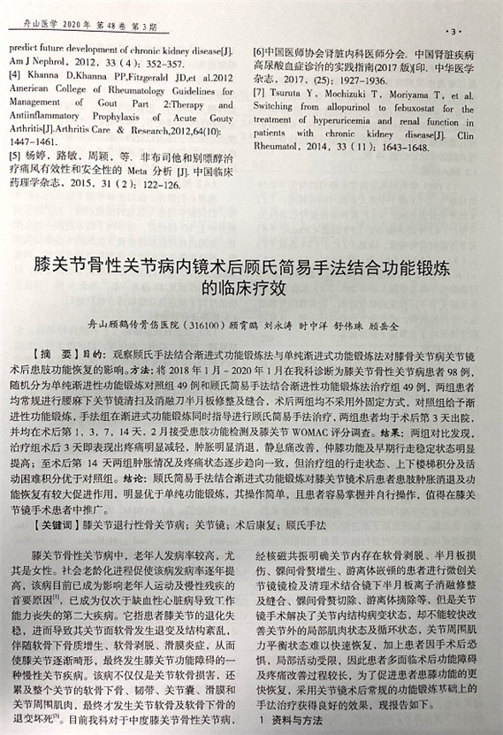 由我院顧霄鵬、劉永濤、戚軍良、時(shí)中洋、舒?zhèn)ブ椤㈩櫾廊柔t(yī)師撰寫的論文《膝關(guān)節(jié)骨性關(guān)節(jié)病內(nèi)鏡術(shù)后顧氏簡(jiǎn)易手法結(jié)合功能鍛煉的臨床療效》在舟山醫(yī)學(xué)雜志上發(fā)表。